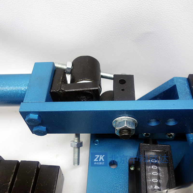 4、將搖臂處于垂直位置,并以此作為試驗的起始狀態將試樣先穿入兩夾片中底板的孔內。然后垂直向上從撥桿的下部穿過撥桿孔,再穿入上夾頭至頂部,轉動上夾頭手柄把線材上端夾緊
