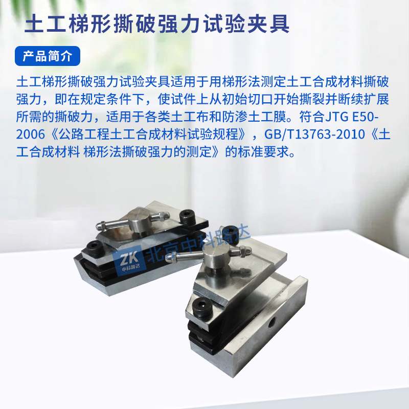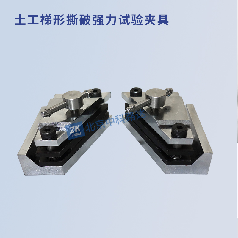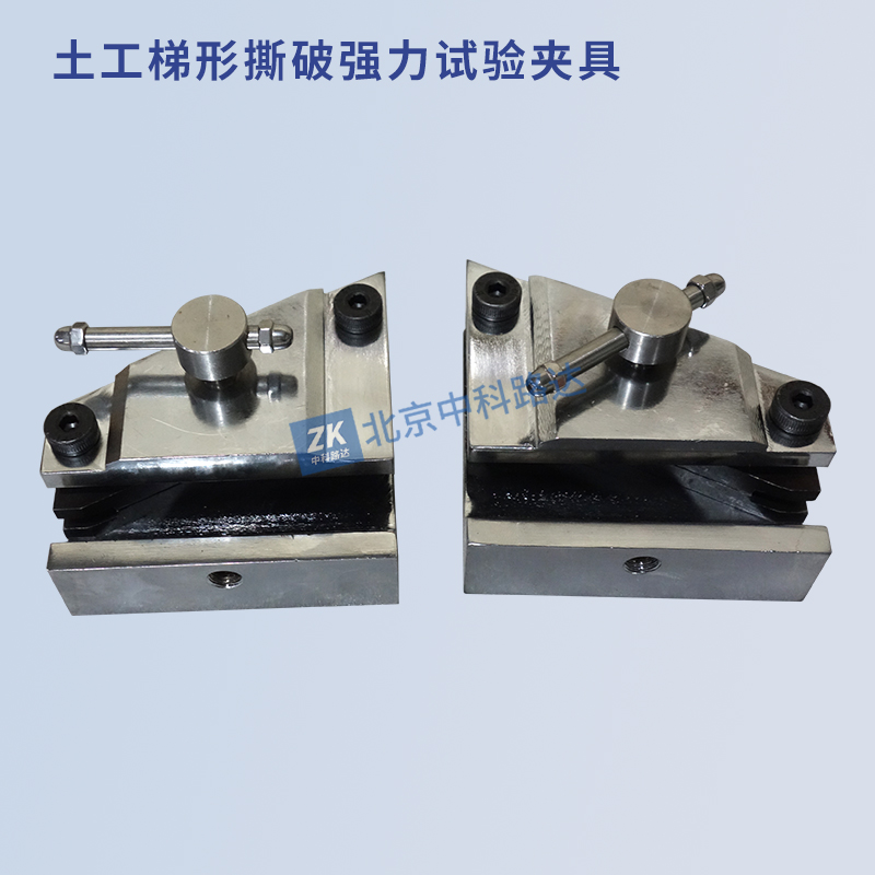 土工梯形撕破強力試驗夾具適用于用梯形法測定土工合成材料撕破強力,即在規定條件下,使試件上從初始切口開始撕裂并斷續擴展所需的撕破力,適用于各類土工布和防滲土工膜。符合JTG E50-2006《公路工程土工合成材料試驗規程》,GB/T13763-2010《土工合成材料 梯形法撕破強力的測定》的標準要求。