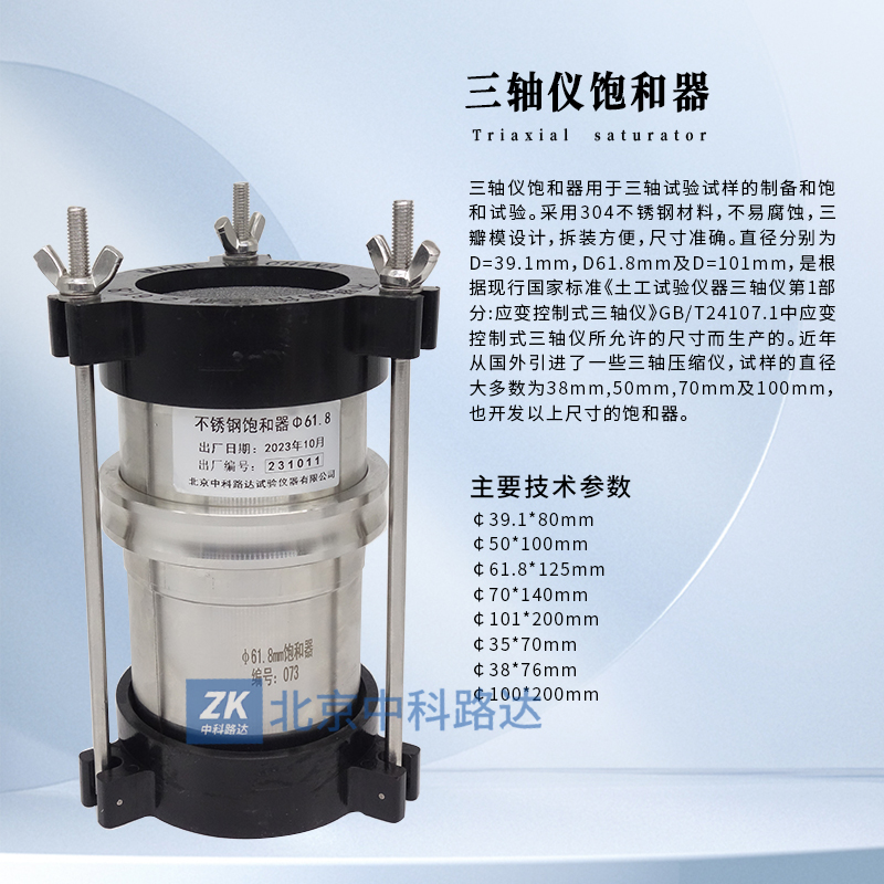 三軸儀飽和器用于三軸試驗(yàn)試樣的制備和飽和試驗(yàn)。采用304不銹鋼材料,不易腐蝕,三瓣模設(shè)計(jì),拆裝方便,尺寸準(zhǔn)確。直徑分別為D=39.1mm,D61.8mm及D=101mm,是根據(jù)現(xiàn)行國家標(biāo)準(zhǔn)《土工試驗(yàn)儀器三軸儀第1部分:應(yīng)變控制式三軸儀》GB/T24107.1中應(yīng)變控制式三軸儀所允許的尺寸而生產(chǎn)的。近年從國外引進(jìn)了一些三軸壓縮儀,試樣的直徑大多數(shù)為38mm,50mm,70mm及100mm,也開了發(fā)以上尺寸的飽和器。