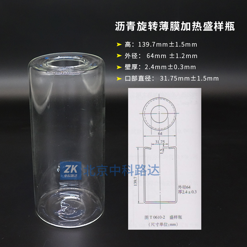 配套薄膜加熱烘箱使用,耐熱玻璃制造。符合JTG E20-2011《公路工程瀝青及瀝青混合料試驗規程》中T0610-2011瀝青旋轉薄膜加熱試驗的標準要求。