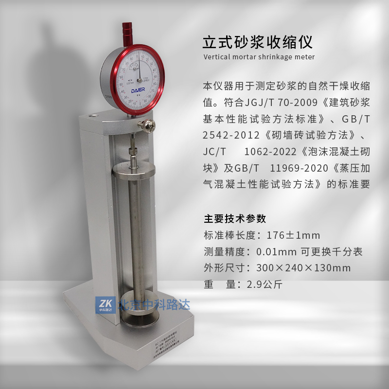 本儀器用于測定砂漿的自然干燥收縮值。符合JGJ/T 70-2009《建筑砂漿基本性能試驗方法標準》、GB/T 2542-2012《砌墻磚試驗方法》、JC/T 1062-2022《泡沫混凝土砌塊》GB/T 11969-2020《蒸壓加氣混凝土性能試驗方法》的標準要求。