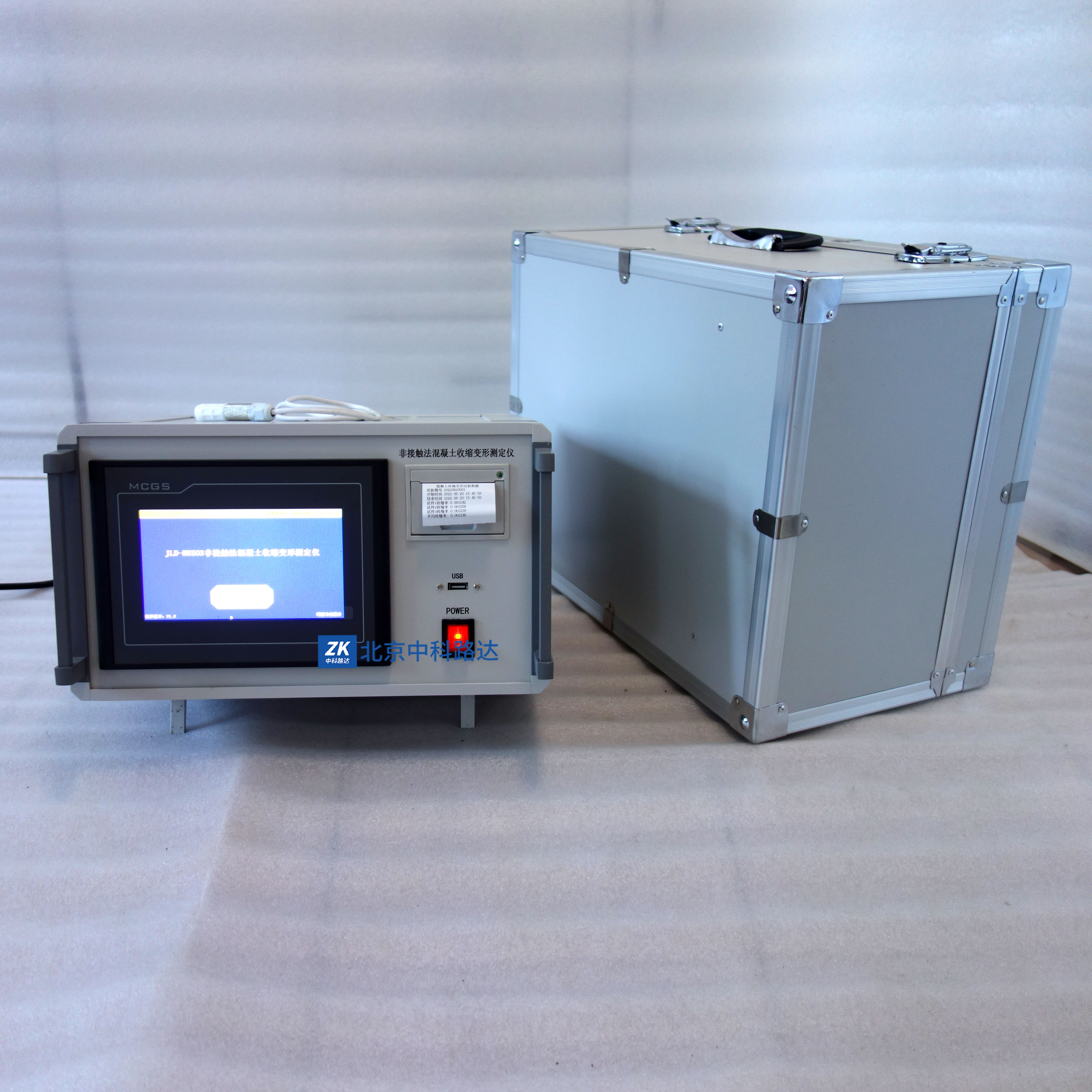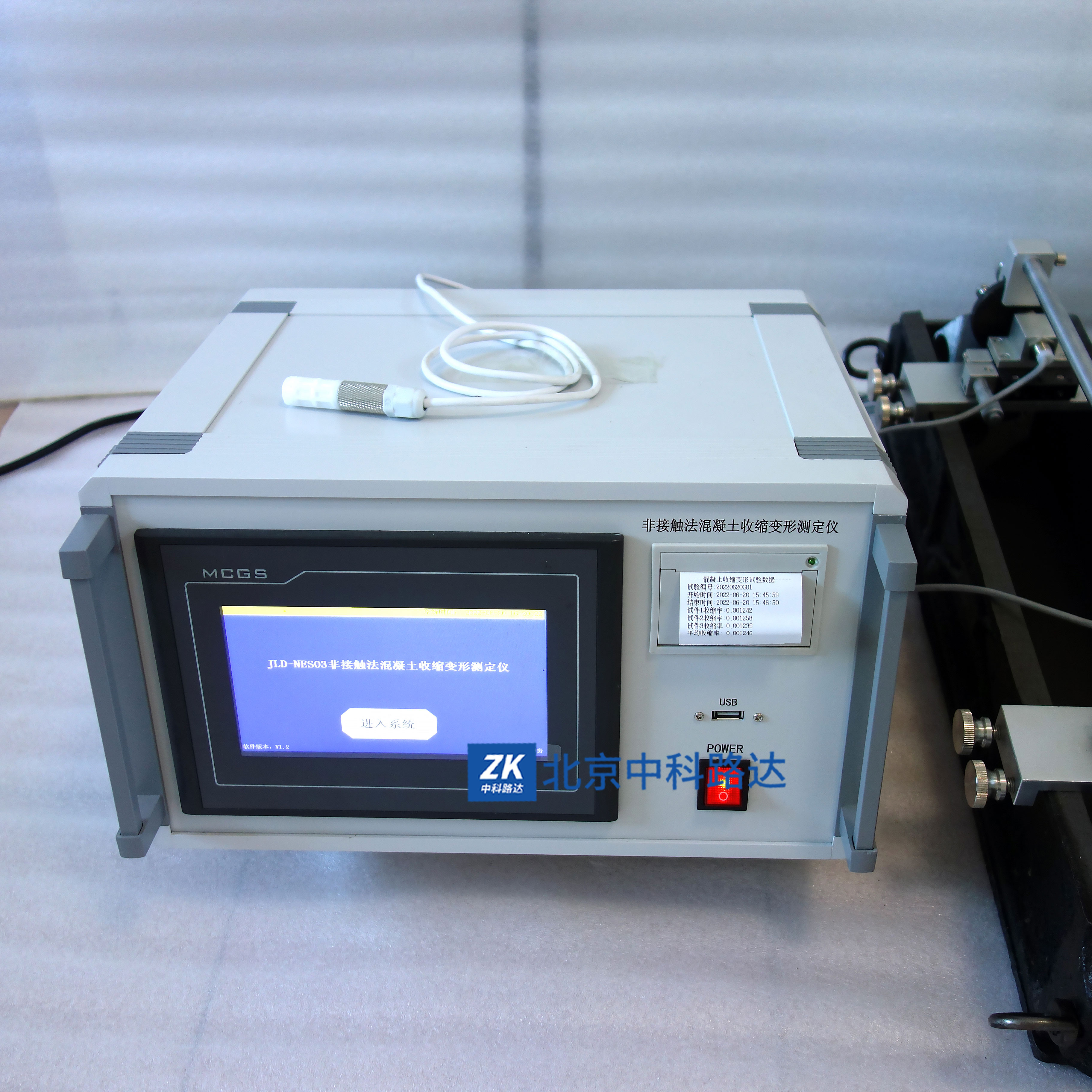 本儀器依據GB/T 50082-2008《普通混凝土長期性能和耐久性能試驗方法標準》所規定的非接觸法混凝土收縮試驗方法生產,適用于測定自成型后任意時段的自由收縮變形,也可用于無約束狀態下混凝土早齡期與外界隔絕濕交換的條件下自收縮變形的測定。儀器由測定儀主機、非接觸式位移傳感器探頭、位移傳感器探頭調節固定裝置和專用混凝土收縮變形測定儀數據處理軟件等組成。該產品結構合理,觸屏控制、自動化程度高,記錄時間準確,性能穩定操作方便,數據可儲存于觸摸屏內,并可調閱歷史數據。