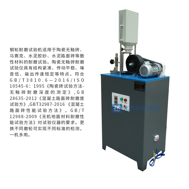 鋼輪耐磨試驗機適用于陶瓷無釉磚、馬賽克、水泥膠砂、水泥路面磚等脆性材料的耐磨試驗。陶瓷無釉磚耐磨試驗儀具有結構緊湊、傳動平穩、噪音低、輸出傳速恒定等特點。符合GB/T3810.6—2016/ISO 10545-6:1995《陶瓷磚試驗方法-無釉磚耐磨深度的測定》,GB 28635-2012《混凝土路面磚耐磨度試驗方》,GBT32987-2016 《混凝土路面磚性能試驗方法》,GB/T 12988-2009《無機地面材料耐磨性能試驗方法》對試驗儀器的要求。更換不同磨輪可實現不同標準的檢測,一機多用。