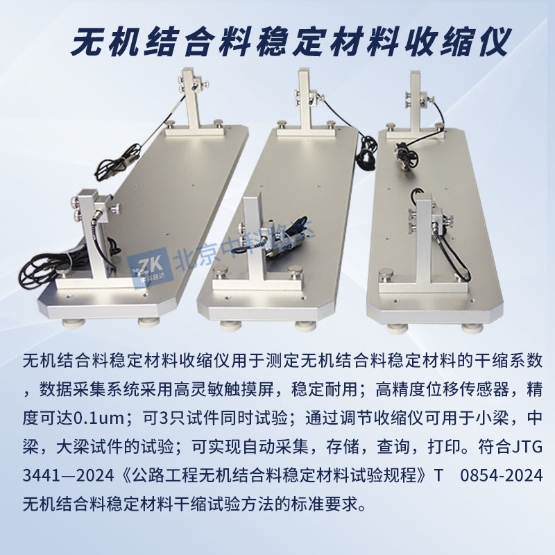 無機(jī)結(jié)合料穩(wěn)定材料收縮儀用于測定無機(jī)結(jié)合料穩(wěn)定材料的干縮系數(shù),數(shù)據(jù)采集系統(tǒng)采用高靈敏觸摸屏,穩(wěn)定耐用;高精度位移傳感器,精度可達(dá)0.1um;可3只試件同時試驗(yàn);通過調(diào)節(jié)收縮儀可用于小梁,中梁,大梁試件的試驗(yàn);可實(shí)現(xiàn)自動采集,存儲,查詢,打印。符合JTG 3441—2024《公路工程無機(jī)結(jié)合料穩(wěn)定材料試驗(yàn)規(guī)程》T 0854-2024無機(jī)結(jié)合料穩(wěn)定材料干縮試驗(yàn)方法的標(biāo)準(zhǔn)要求。...