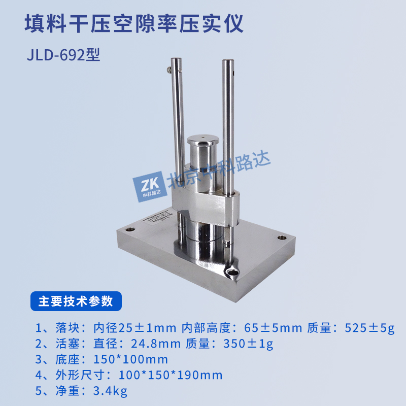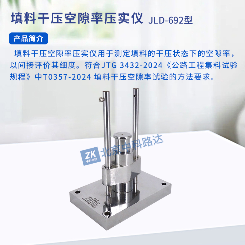 填料干壓空隙率壓實儀用于測定填料的干壓狀態下的空隙率,以間接評價其細度。符合JTG 3432-2024《公路工程集料試驗規程》中T0357-2024 填料干壓空隙率試驗的方法要求。