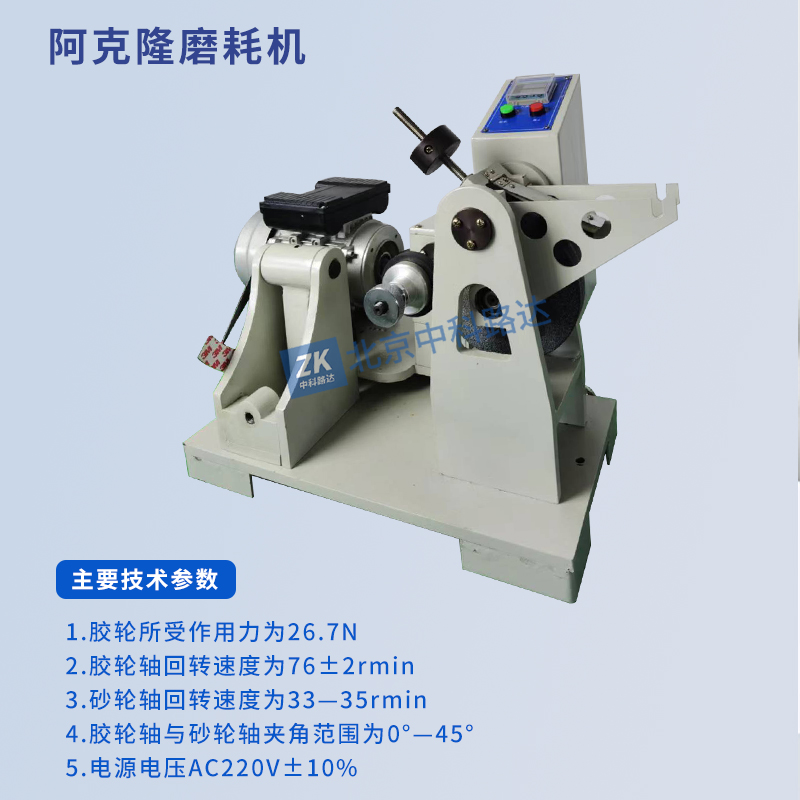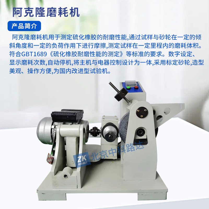 阿克隆磨耗機用于測定硫化橡膠的耐磨性能,通過試樣與砂輪在一定的傾斜角度和一定的負荷作用下進行摩擦,測定試樣在一定里程內的磨耗體積。符合GBT1689《硫化橡膠耐磨性能的測定》等標準的要求。數字設定、顯示磨耗次數,自動停機,將主機與電器控制設計為一體,采用標定砂輪,造型美觀、操作方便,為國內改進型試驗機。