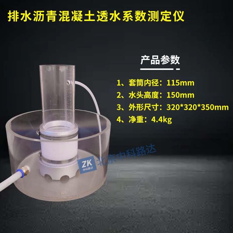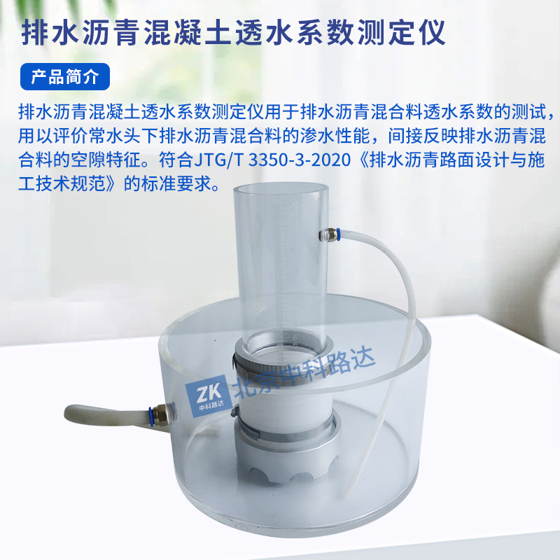 排水瀝青混凝土透水系數測定儀用于排水瀝青混合料透水系數的測試,用以評價常水頭下排水瀝青混合料的滲水性能,間接反映排水瀝青混合料的空隙特征。符合JTG/T 3350-3-2020《排水瀝青路面設計與施工技術規范》的標準要求。