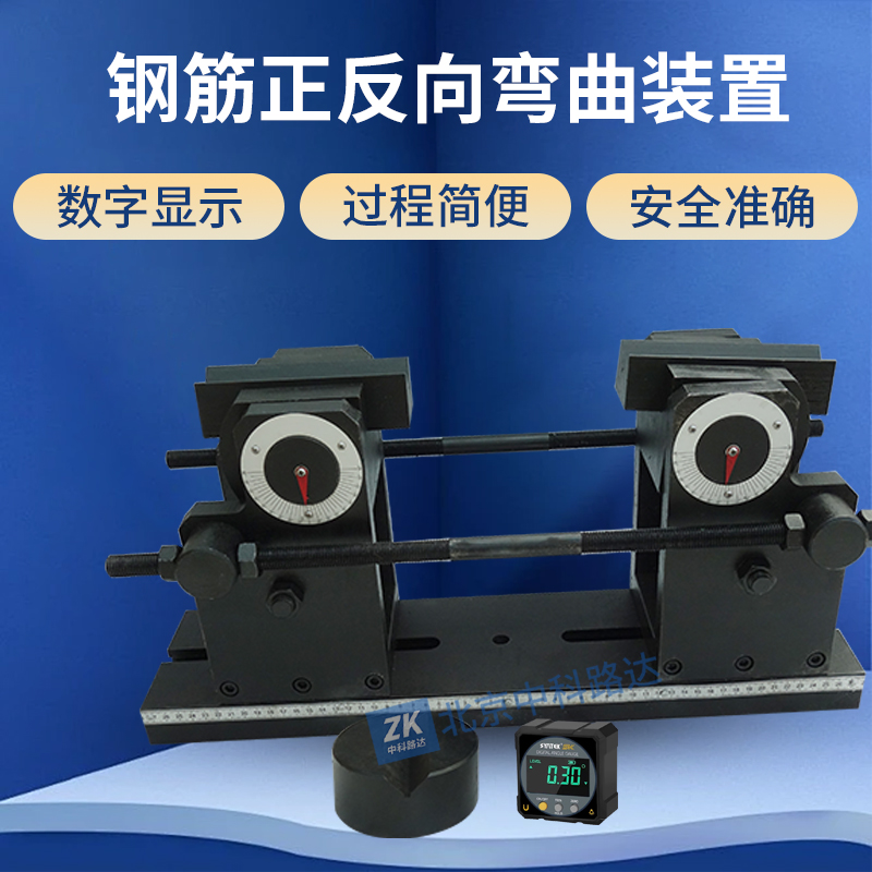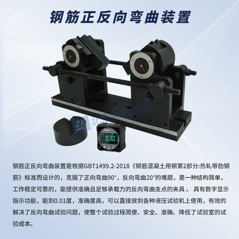 鋼筋正反向彎曲裝置是根據GBT1499.2-2018《鋼筋混凝土用鋼第2部分:熱軋帶肋鋼筋》標準而設計的,克服了正向彎曲90°,反向彎曲20°的難題,是一種結構簡單,工作穩定可靠的,能提供準確且足夠承載力的反向彎曲支點的夾具 。 具有數字顯示指示功能,能到0.01度,準確度高,可以直接放到各種液壓試驗機上使用,有效的解決了反向彎曲試驗問題,使整個試驗過程簡便、安全、準確、降低了試驗室的試驗成本。