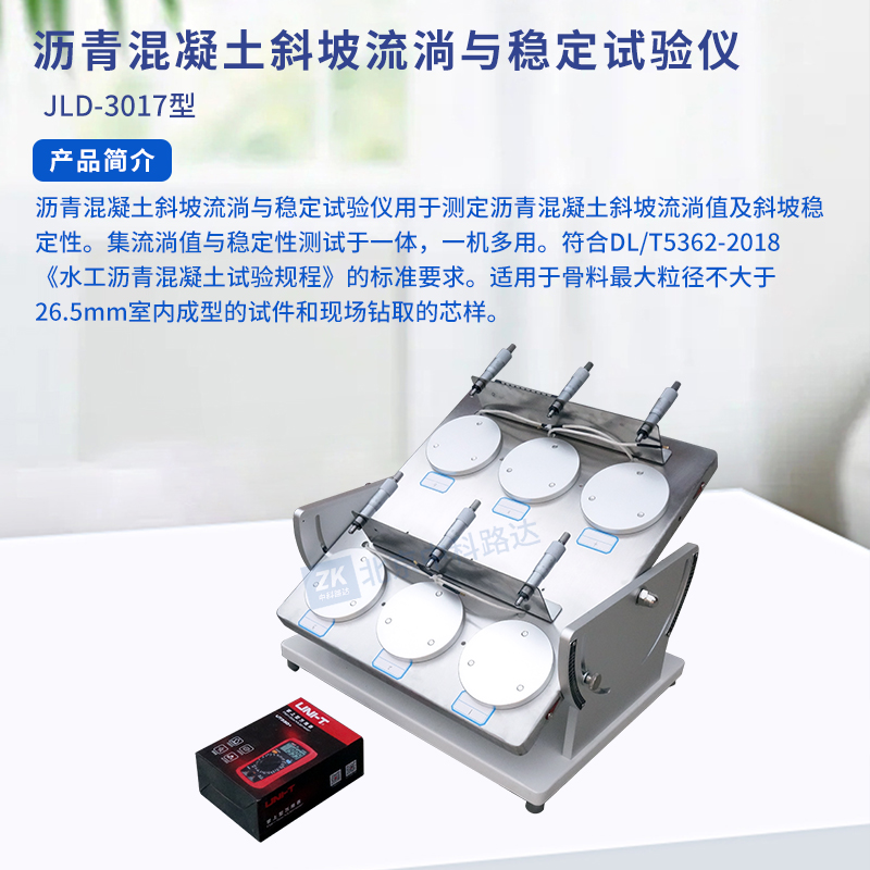 瀝青混凝土斜坡流淌與穩(wěn)定試驗(yàn)儀用于測(cè)定瀝青混凝土斜坡流淌值及斜坡穩(wěn)定性。集流淌值與穩(wěn)定性測(cè)試于一體,一機(jī)多用。符合DL/T5362-2018《水工瀝青混凝土試驗(yàn)規(guī)程》的標(biāo)準(zhǔn)要求。適用于骨料最大粒徑不大于26.5mm室內(nèi)成型的試件和現(xiàn)場(chǎng)鉆取的芯樣。