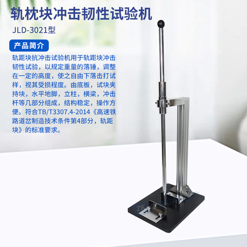 軌距塊抗沖擊試驗(yàn)機(jī)用于軌距塊沖擊韌性試驗(yàn),以規(guī)定重量的落錘,調(diào)整在一定的高度,使之自由下落擊打試樣,視其受損程度。由底板,試塊夾持塊,水平地腳,立柱,橫梁,沖擊桿等幾部分組成,結(jié)構(gòu)穩(wěn)定,操作方便。符合TB/T3307.4-2014《高速鐵路道岔制造技術(shù)條件第4部分,軌距塊》的標(biāo)準(zhǔn)要求。